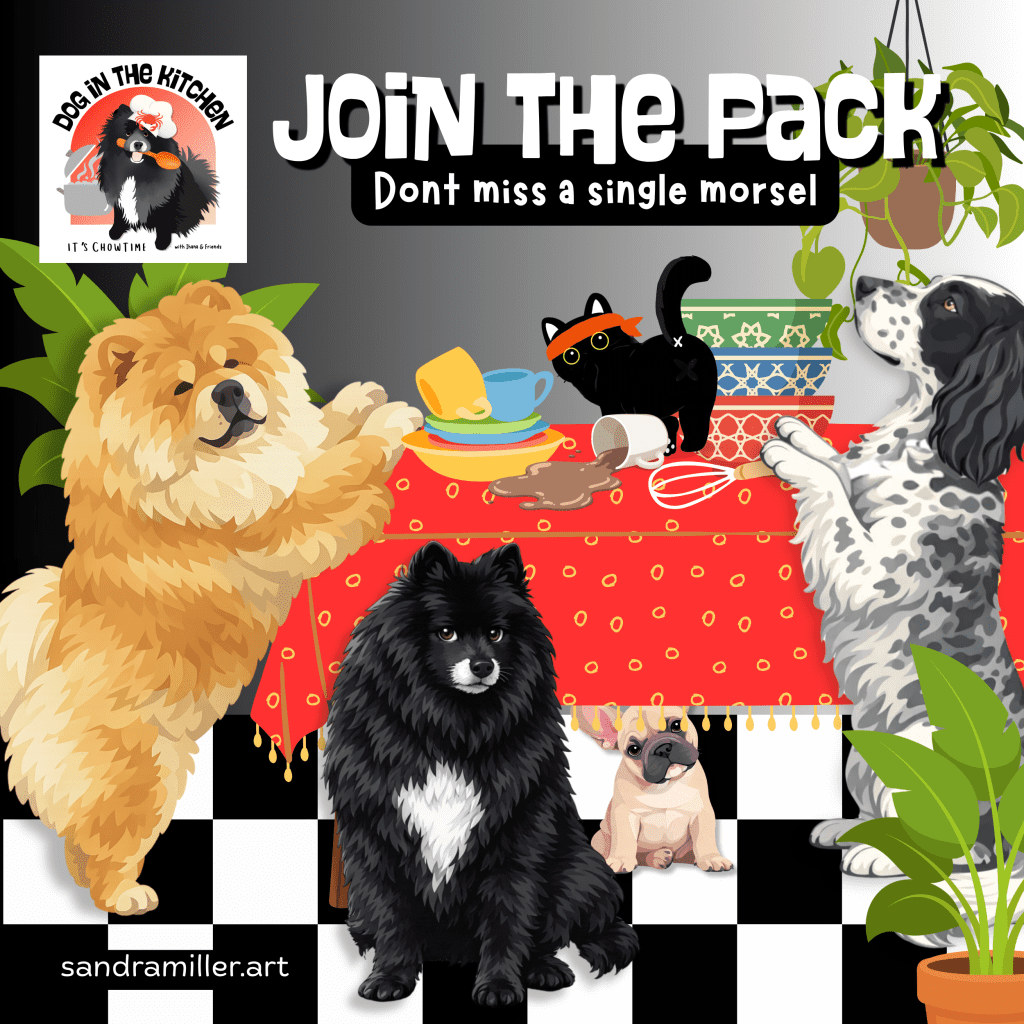 Receive first notice of my newest available original designs, DOG IN THE KITCHEN™ lllustrations and recipes, inspiration photo calls and auction announcements. as well as musings from my art studio, travels, and gardens! Don’t be a WHISK taker…you won’t want to miss a single morsel!!